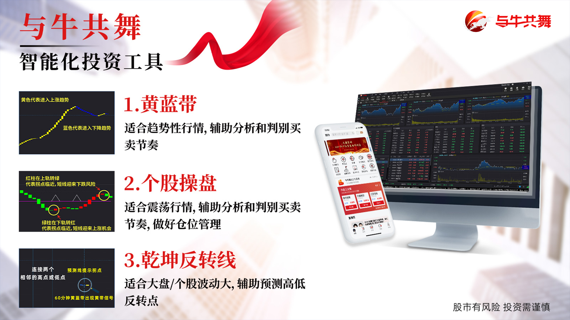 而我们的与牛共舞软件,可以帮助我们解决这个难题。我们的软件是经超级计算机并行计算校验,把A 股30多年、 60多个行业、300多个热点板块、4000多只股票反复回测寻找的最优参数!可以把过往的数据,技术战法,全部变成参数,由指标信号来辅助您做出判断,而且操 作方法非常简单好学,易上手,容易学得会!