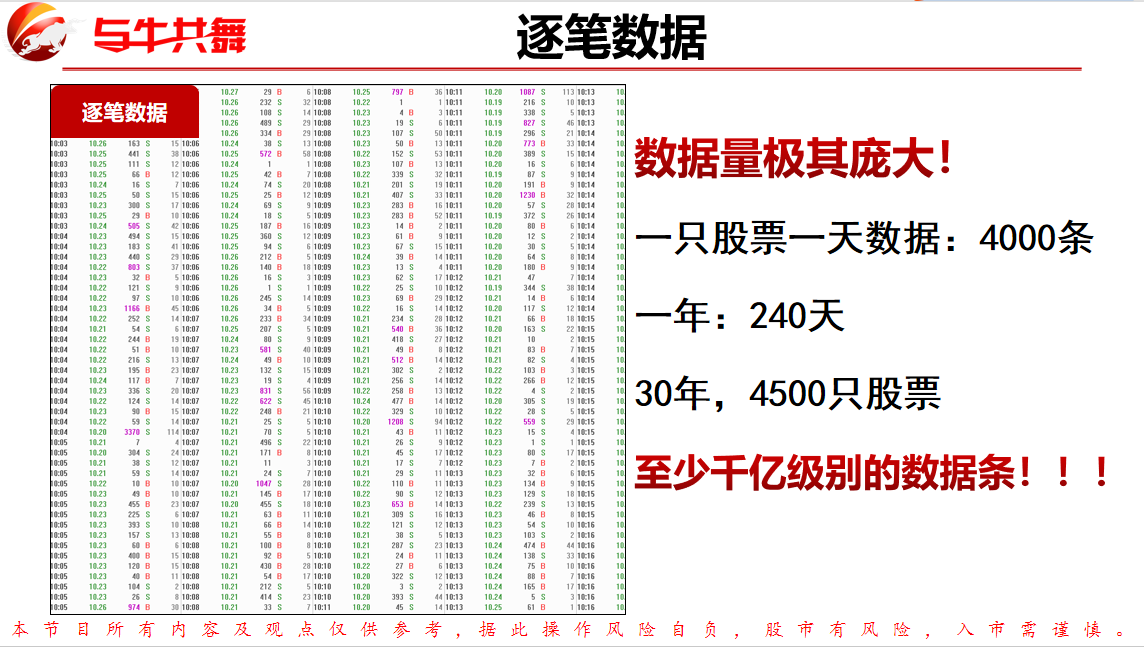 首先,我们知道,A股逐笔数据量加起来是极其庞大的!如果一只股.票一天数据,那就是4000条数据,一年如果按240个交易日来算,按照30年来算的话,4500只股票加起来至少是千亿级别的数据!!!