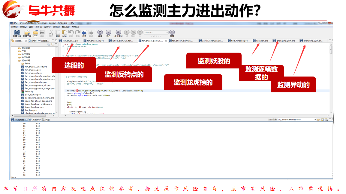 您看一下,如何选股、监测转折点、监测龙虎榜、监测妖股、监测逐笔数据、监测异动,我们有大数据专家程超领衔的专家团队研发的大数据程序,只要几秒就可以实现。