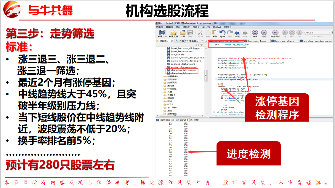 其实这个数据非常庞大,如果依靠个人的话您可能需要至少半年的时间,而咱们与牛共舞是把这些选股的标准加入到选股程序当中来,具体设计三个标准: