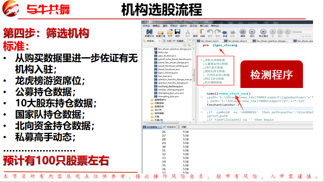尤其是一只股到底有没有公募、私募在买,都通过咱们的程序进行检测,经过这一步筛选还剩下100只股左右